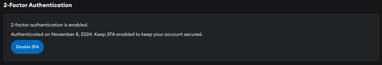 To enable 2FA authentication on your account, on the dashboard go to Settings -> Account, and select Enable.